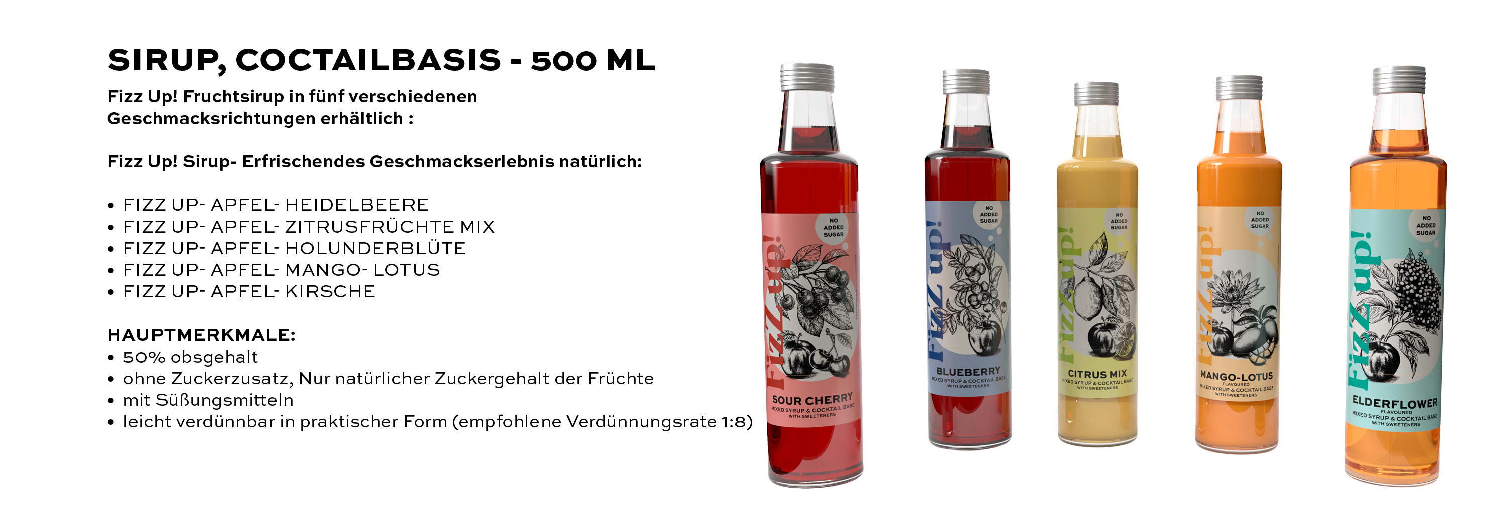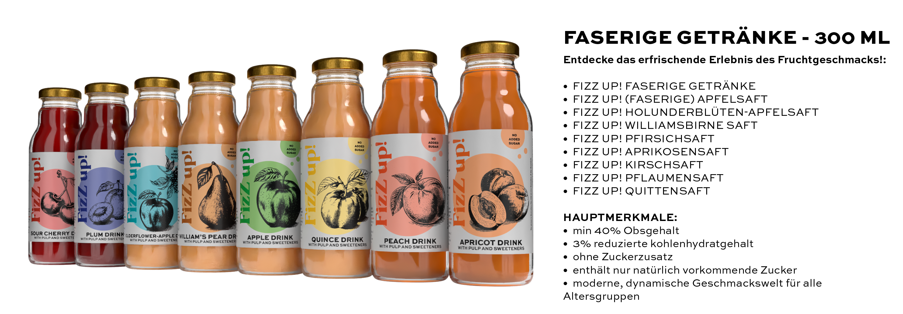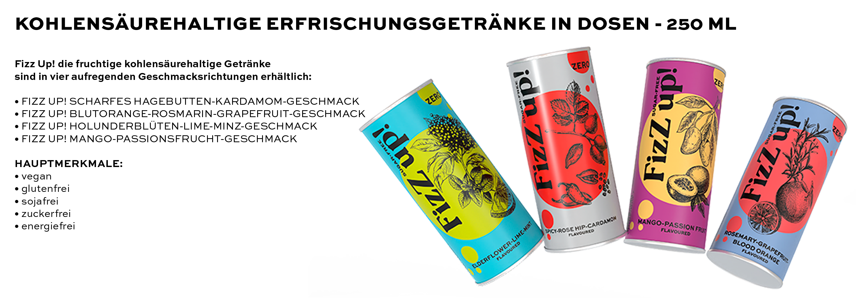 Diese fruchtbaren, kohlensäurehaltigen Fizz Up! Getränke passen sich perfekt an die vielfältigen Ernährungs- und Lebensgewohnheiten der modernen Verbraucher an. Mit unseren einzigartigen, innovativen Geschmacksrichtungen – wie scharfer Hagebutte–Kardamom, Blutorange–Rosmarin, Holunder–Limette–Minze oder Mango–Maracuja – bieten wir eine echte Neuheit auf dem Markt an.